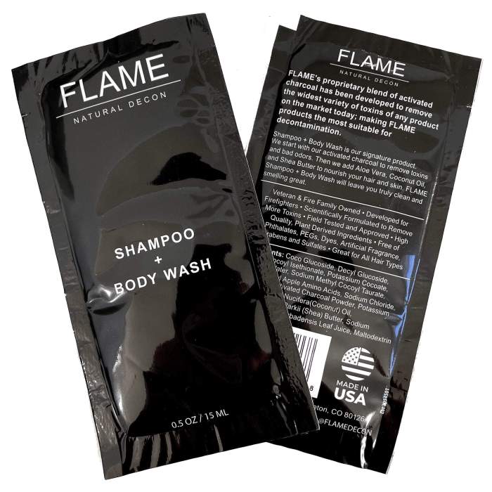 Shampoo + Gel de Baño FLAME® (250 ml) para la descontaminación de bomberos y personal de emergencia. Elimina toxinas, hollín, metales y residuos peligrosos gracias a su fórmula con carbón activado. Hidrata con aloe vera, coco y karité. Limpieza profunda, segura y efectiva tras cada intervención.